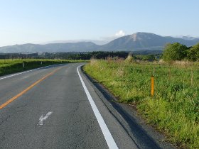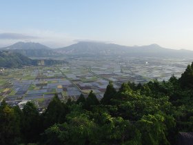 阿蘇のカルデラに向かって下って行く。そこは今までの景色と違ってまったく平らで広大。そこに何面もの畑や田んぼが延々と続いている。