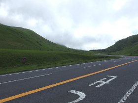 湯布院から一時やまなみハイウエイに入り、次の九重”夢”大吊橋に向かう。やまなみハイウエイは、県道ではあるが湯布院から熊本県阿蘇郡南小国町まで続く景色のすばらしい山岳道路でドライブに人気の道だ。九重山を抜け、阿蘇エリアに入ると見晴らしの素晴らしい景色が広がる。