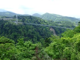 対岸のほうに来てしまったようだ。山中の小道のようなところを歩いて行くと吊り橋の塔がが少しずつ見えてくる。たもとまで行って辺りを見まわすとあまり生活感が感じられない。この橋は、2006年に観光目的で架けられた歩行者専用の橋で、谷底まで173m、全長390mあり、眼下には鳴子川渓谷と滝、遠くには九重連山が見渡せる。通行料は往復500円で、夜間は閉鎖される。