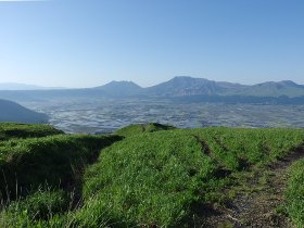 阿蘇の草原の風景は素晴らしいが、南へ下ってカルデラのなかの田畑が広がる田園風景が見えてくると何だかホッとする。この田園風景は、火口の北と南の両側に見える。