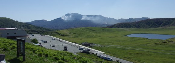 右に見える池の付近は草千里、左の駐車場の奥には阿蘇火山博物館がある。