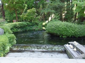 白川水源駐車場に車を停め、その先を歩いて行くと100m程で清流が流れる小川が見えてくる。そこから上流に沿って歩道が整備され、木立が立ち並んで遊歩道のようになっている。ぶらぶら300mほどあるいて行くと一級河川白川の水源に辿り着く。環境省の名水百選の一つだ。