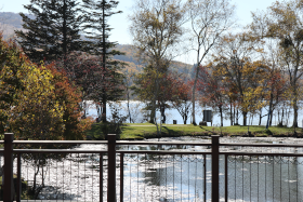 女神湖から10分ほど坂道を下っていくと華やかな建物の一群が見えてくる。その先に白樺湖が広がり、湖面をキラキラ輝かせて自分の存在をしっかり主張している。