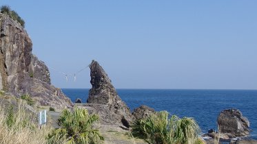 海に突き出た鹿岡鼻の先にある奇岩。2つの岩がしめ縄で結ばれている。