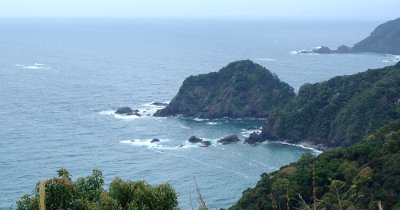 16:14土佐清水港から暫く、両側に小木が並ぶ山の中のような道を、折からの雨風で飛ばされた木の葉や小枝を巻き上げながら走る。