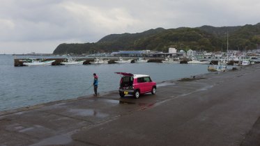 17:30山を下りて、土佐清水港で一休み。車の横にはね上げた落ち葉がびっしりこびり付いていた。