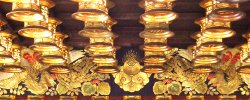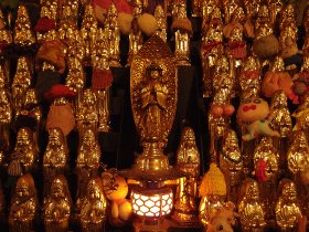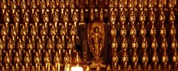 階段を降りていくと、はじめは一面に何かの模様が描かれているように見えたが、目が慣れてくるとそれが小さな観音像で、狭い通路の両側に上から下まで隙間なくきれい並べられているのが見えてくる。四角い回廊になっており、ところどころに置かれた明かりに照らされて黄金に輝く観音像が仄かに浮かび上がってくる。